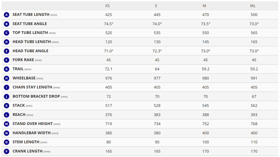 XS:165mm, S:165mm,